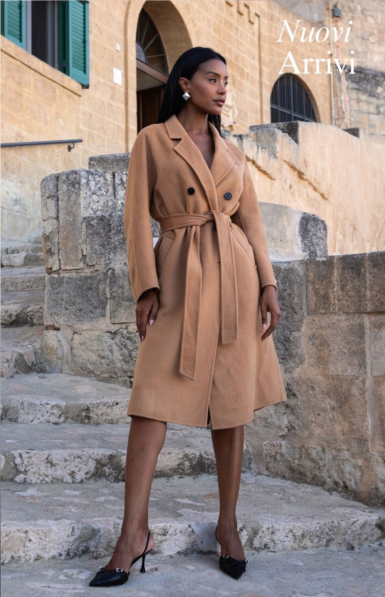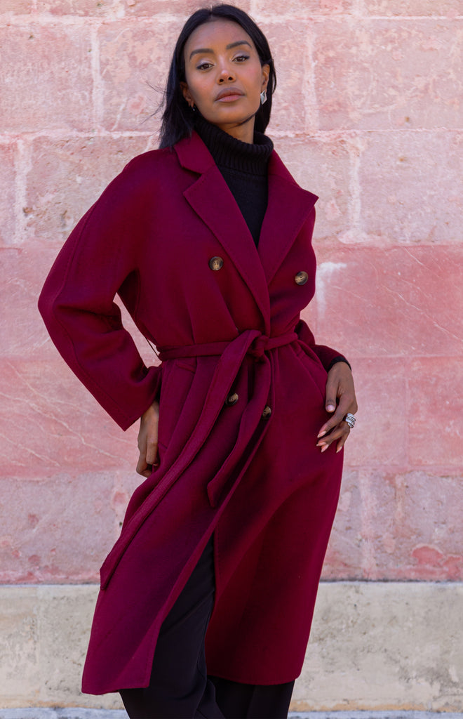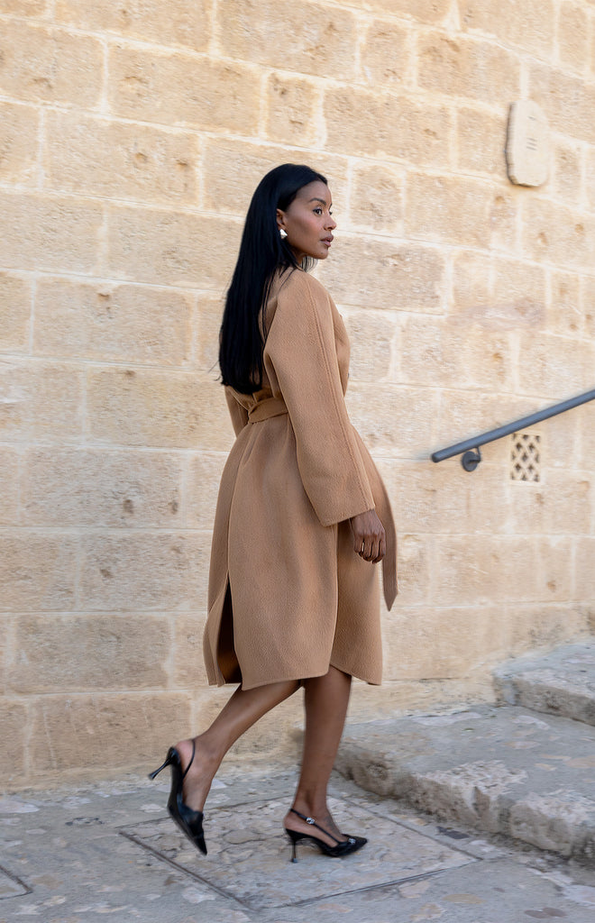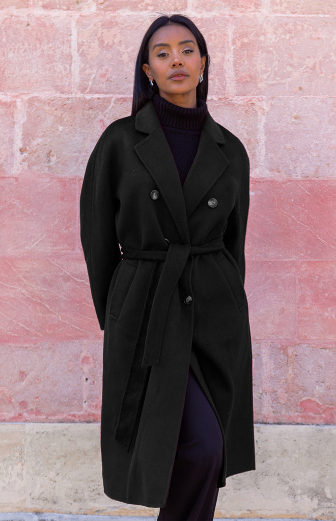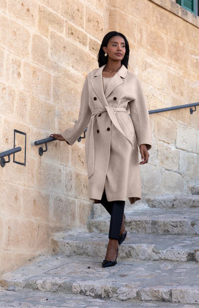 Timeless hand-stitched coat, crafted with attention to detail and high-quality finishes in luxurious Merino Wool and Cashmere, offering softness, warmth, and comfort. The coat features a midi length and a slightly oversized fit that can be adjusted with the tone-on-tone belt secured through delicate belt loops.