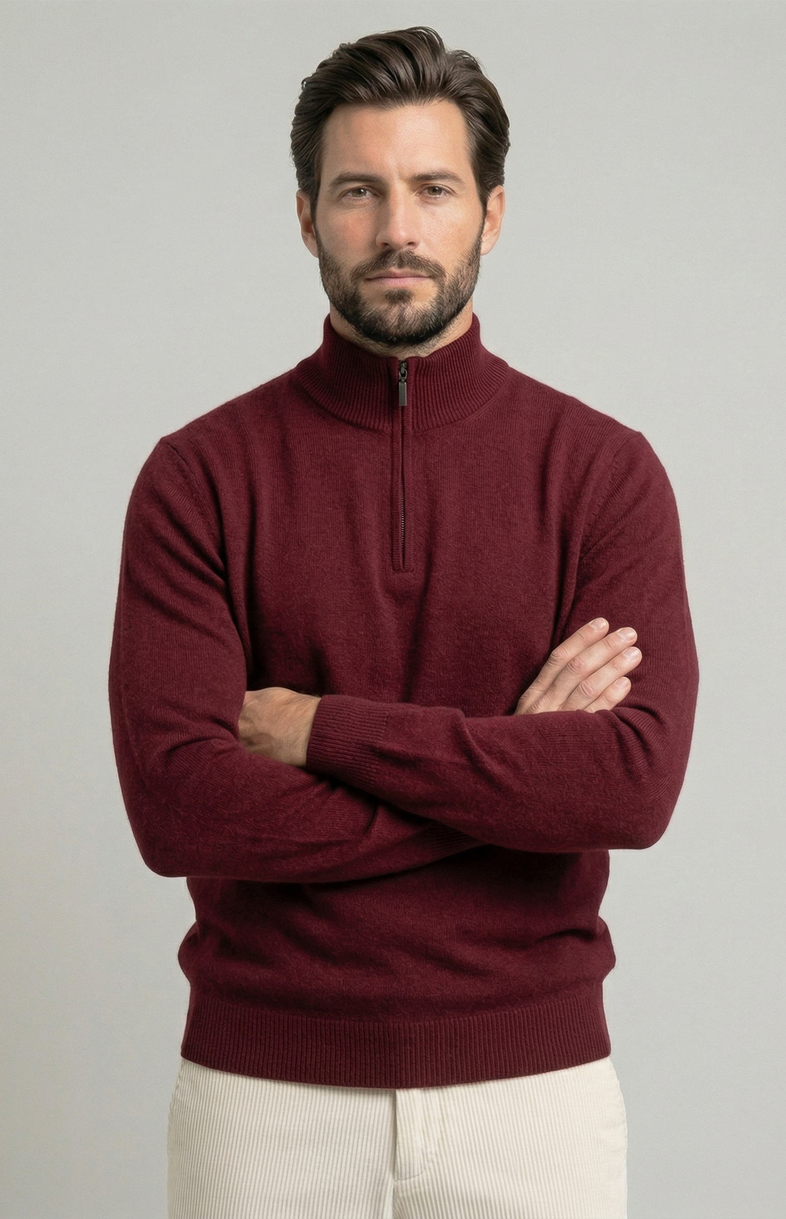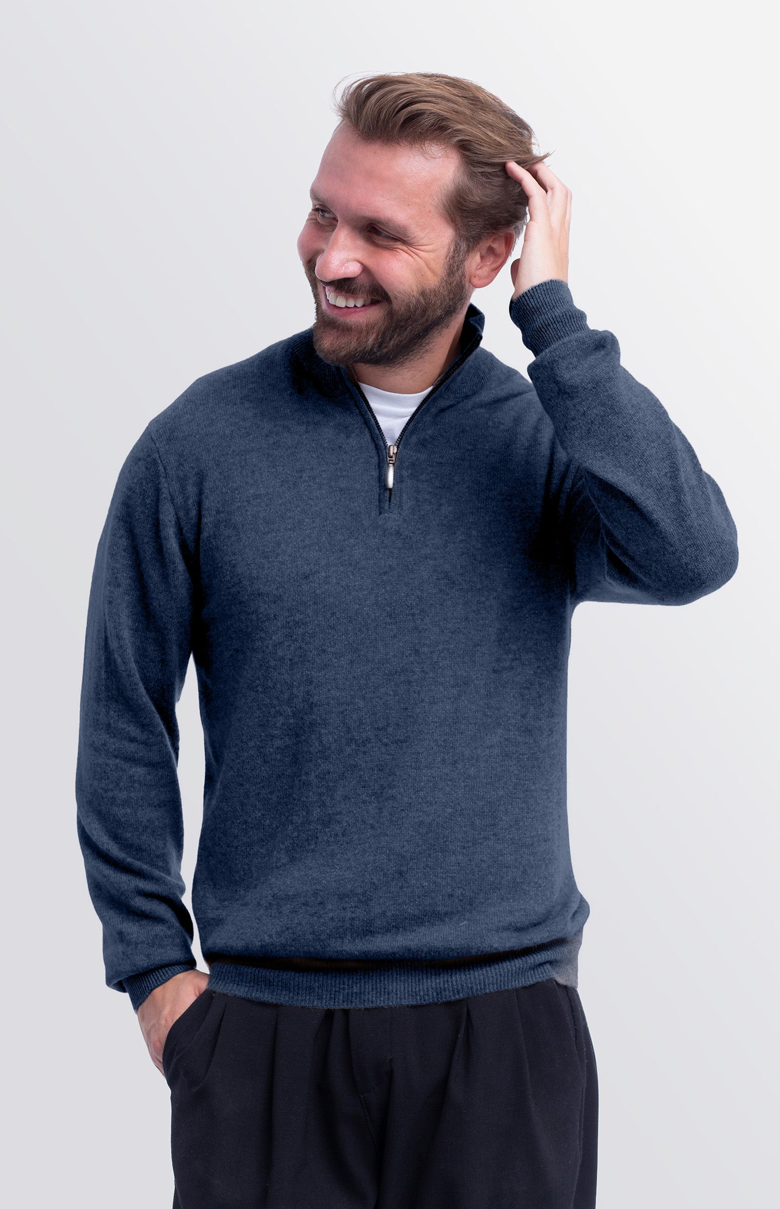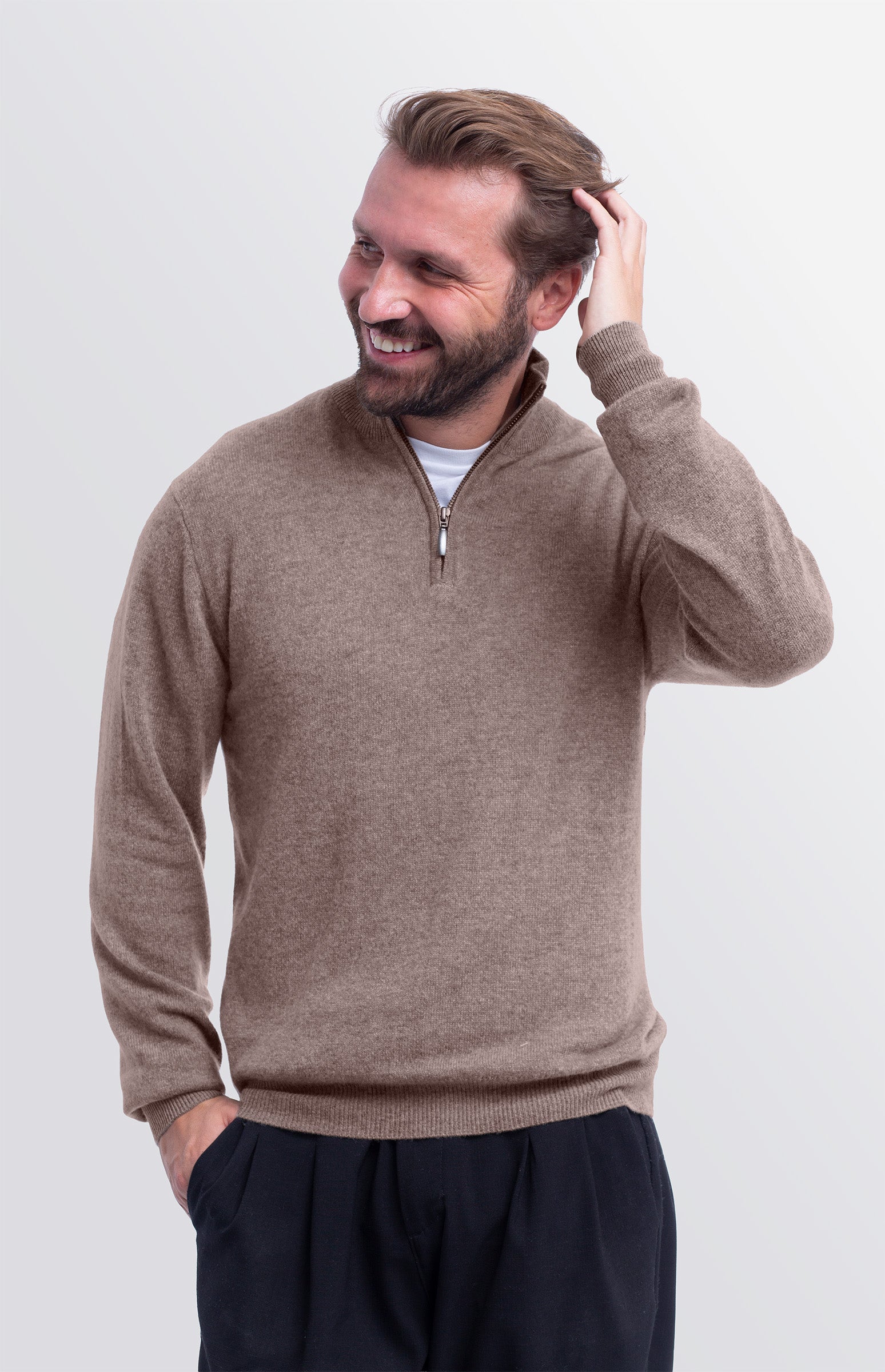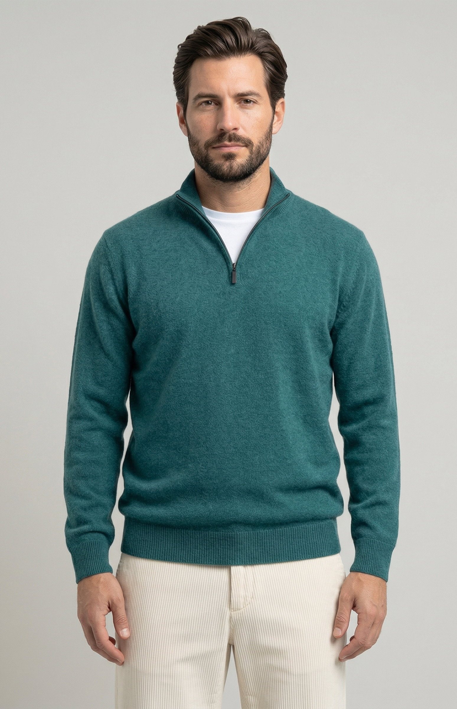 Men's 100% cashmere turtleneck jumper with zip. Elegant and sophisticated, it features ribbed detailing on the collar, sleeves and hem. The front zip design makes it practical and versatile, ideal for both professional looks and casual-chic outfits. Soft and warm, this high-quality cashmere jumper ensures comfort and style for any occasion.