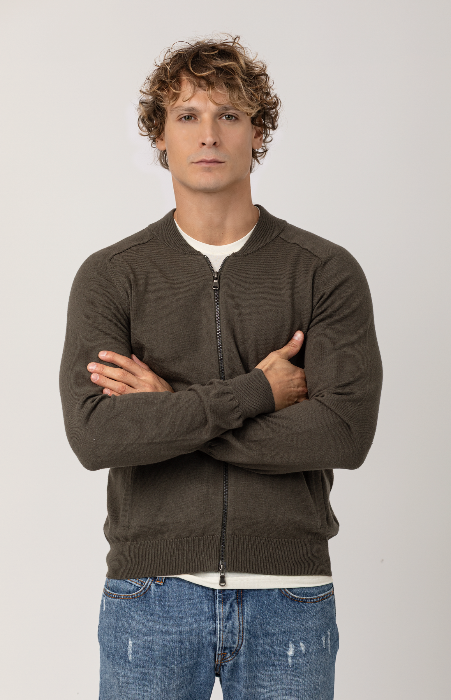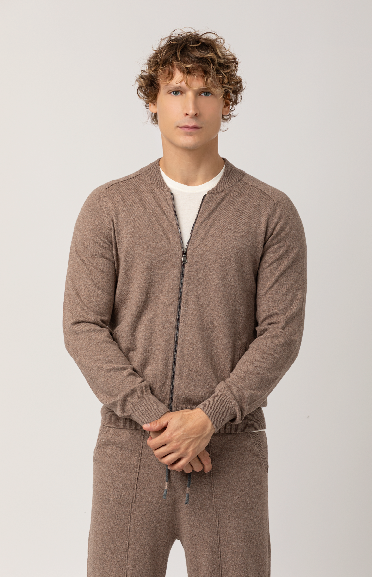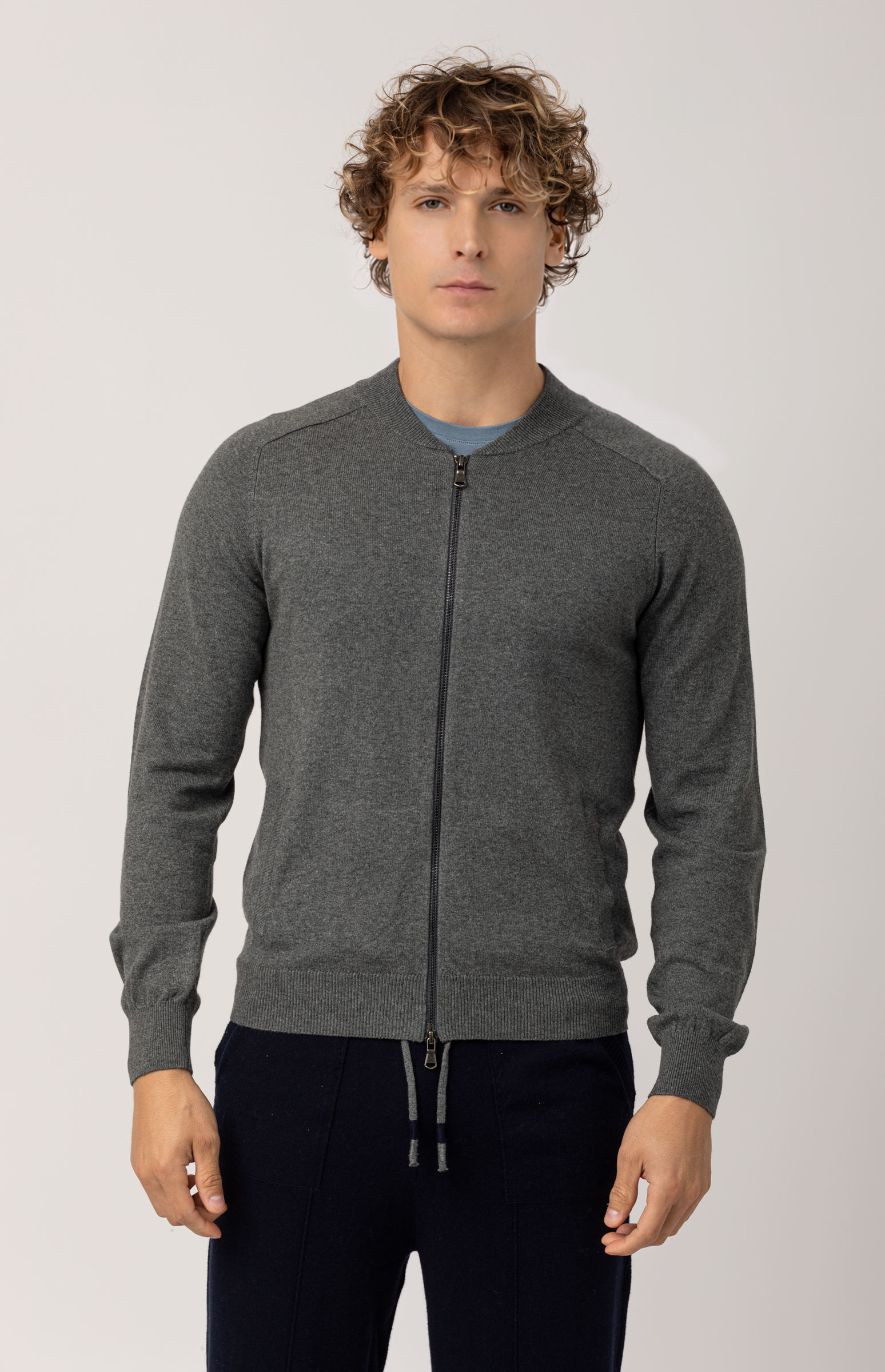 Made from fine cotton-cashmere yarn, this men's sweatshirt with zip mixes sporty lightness with the natural softness of fine fabrics. The bomber collar and full zip make it a versatile piece, designed to add a touch of casual elegance to everyday looks.