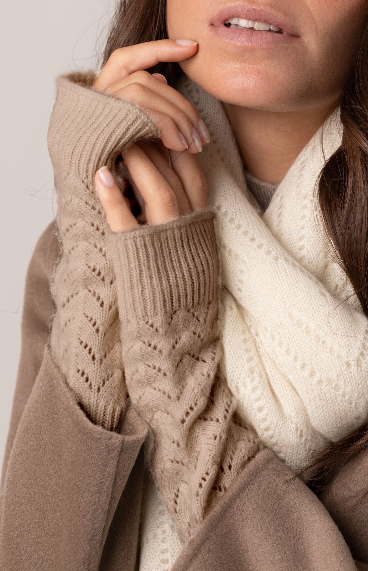 Pointelle-worked sleeves are a sophisticated and functional accessory, perfect for colder days when you want to protect your arms without sacrificing lightness and sophistication. Pointelle workmanship, with its interplay of openwork and subtle patterns, adds a touch of elegance to this accessory, making it ideal for casual-chic outfits as well.