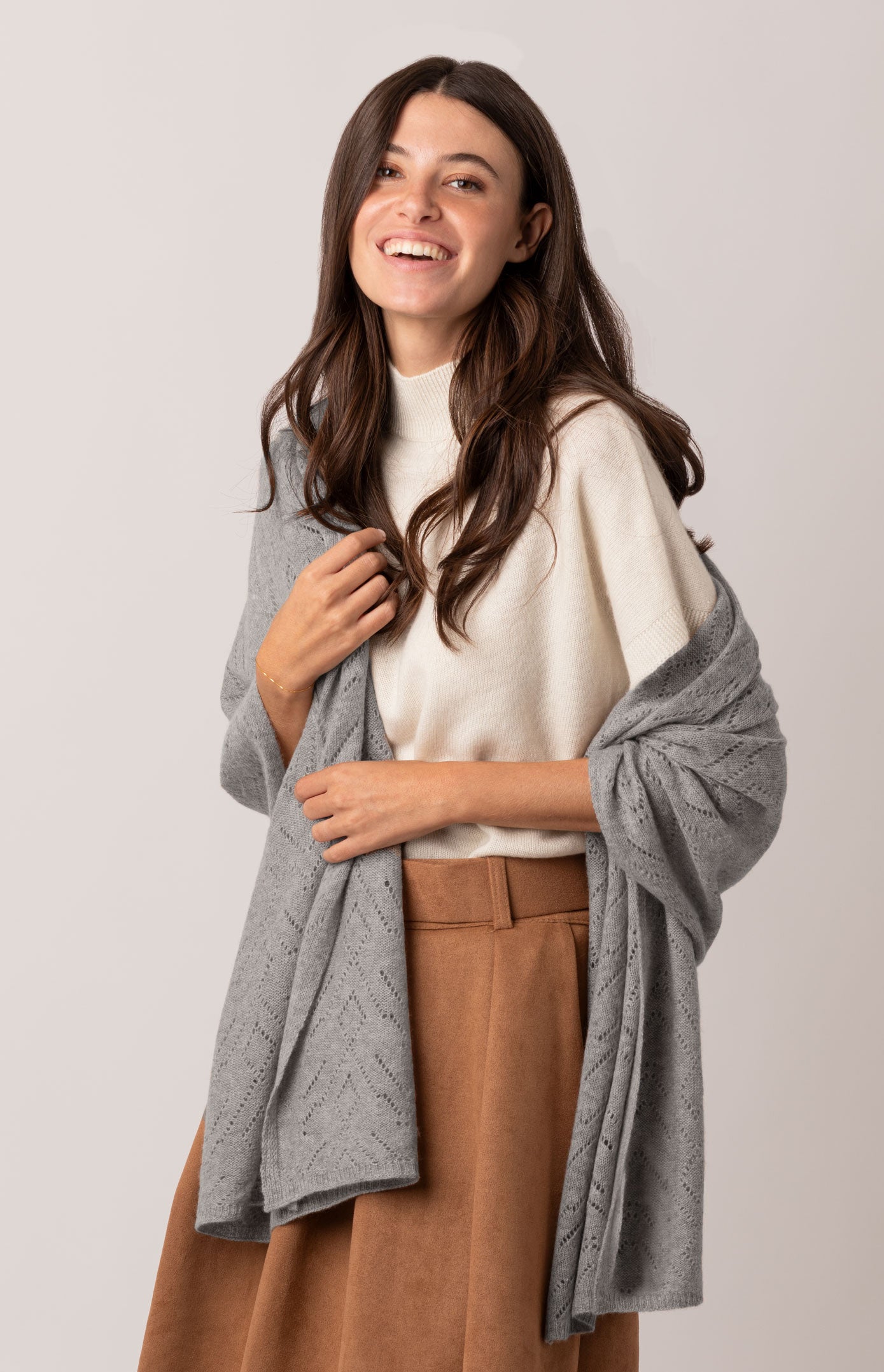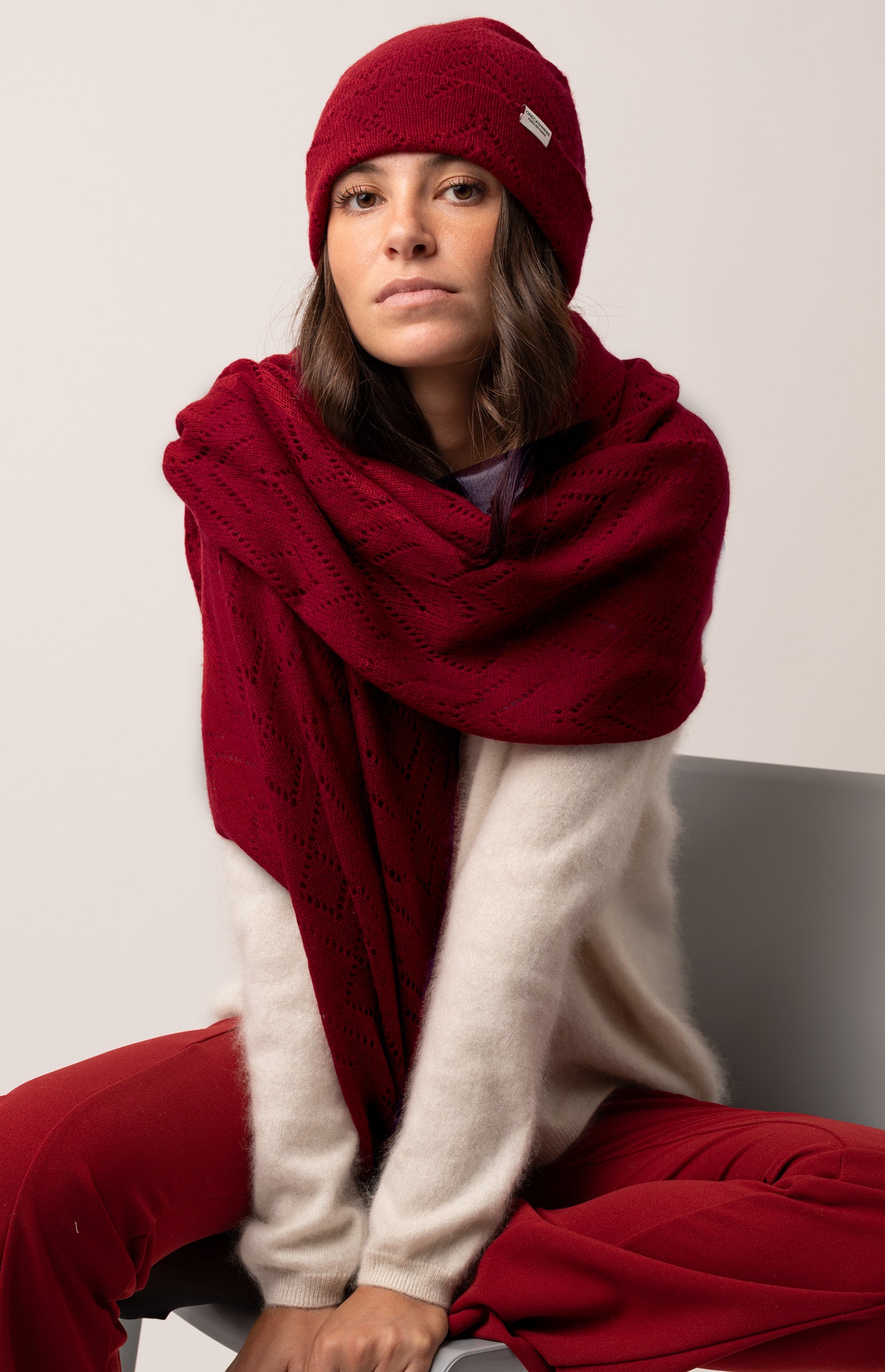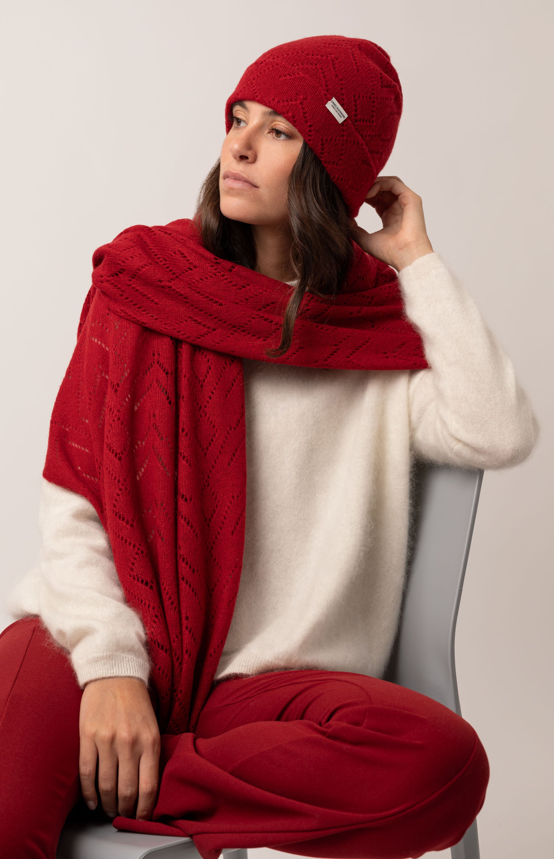 The pointelle-knit cashmere scarf is a refined and elegant accessory, perfect for autumn and winter. The "pointelle" stitch workmanship adds a touch of lightness to the softness of cashmere. Pair it with his hat to create a beautiful, Christmassy hat and scarf ensemble.