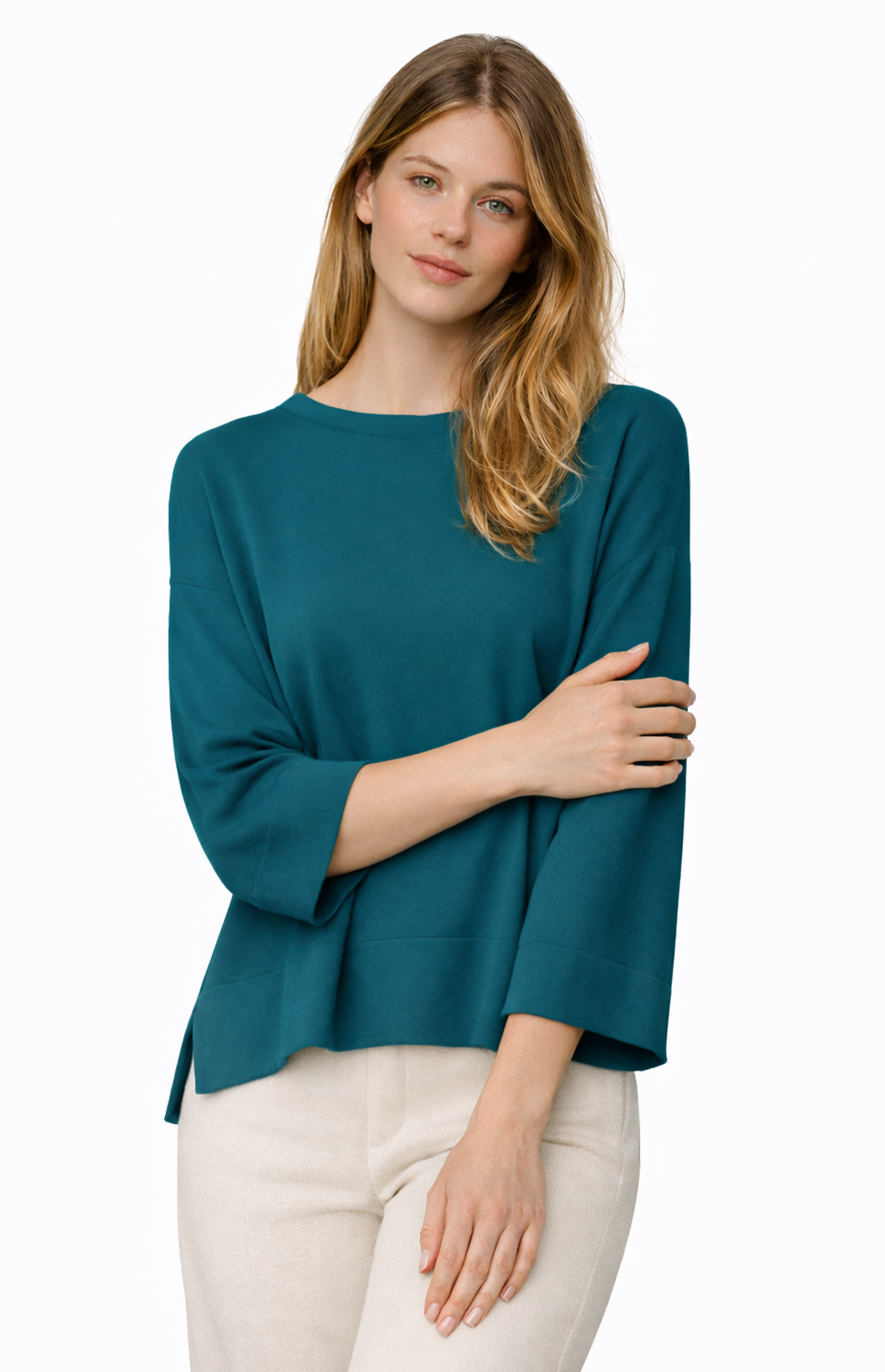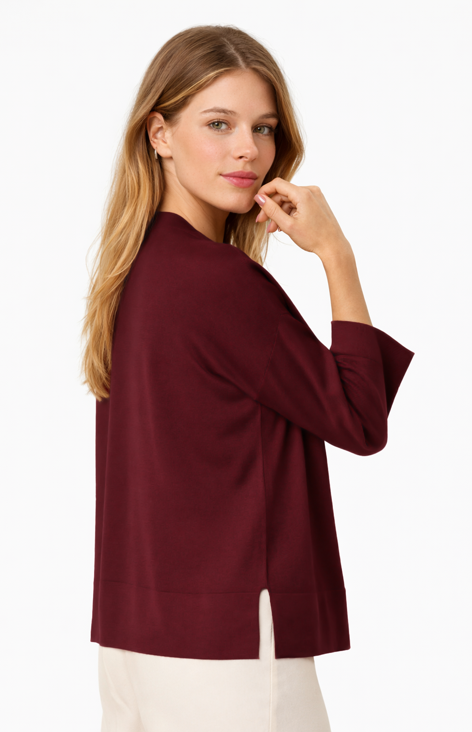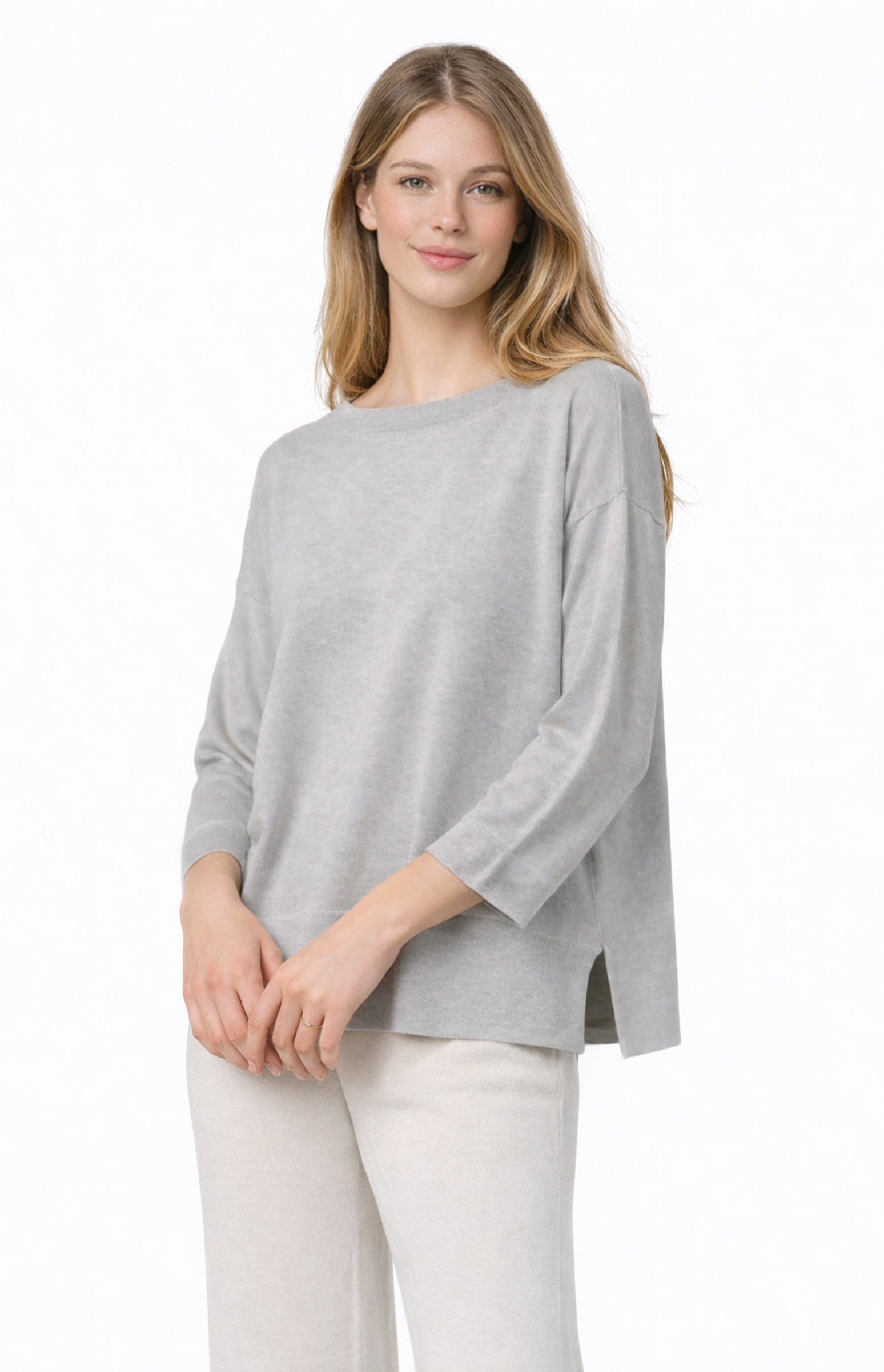 Beautiful sweater with three quarter sleeves made in Silk and Cashmere. Side slit for fluid movements. More chic and elegant blusa. Wide round neckline with tubular finish also on the bottom of the sleeves and shirt. Shoulders low and broad, not constricting on the arms.