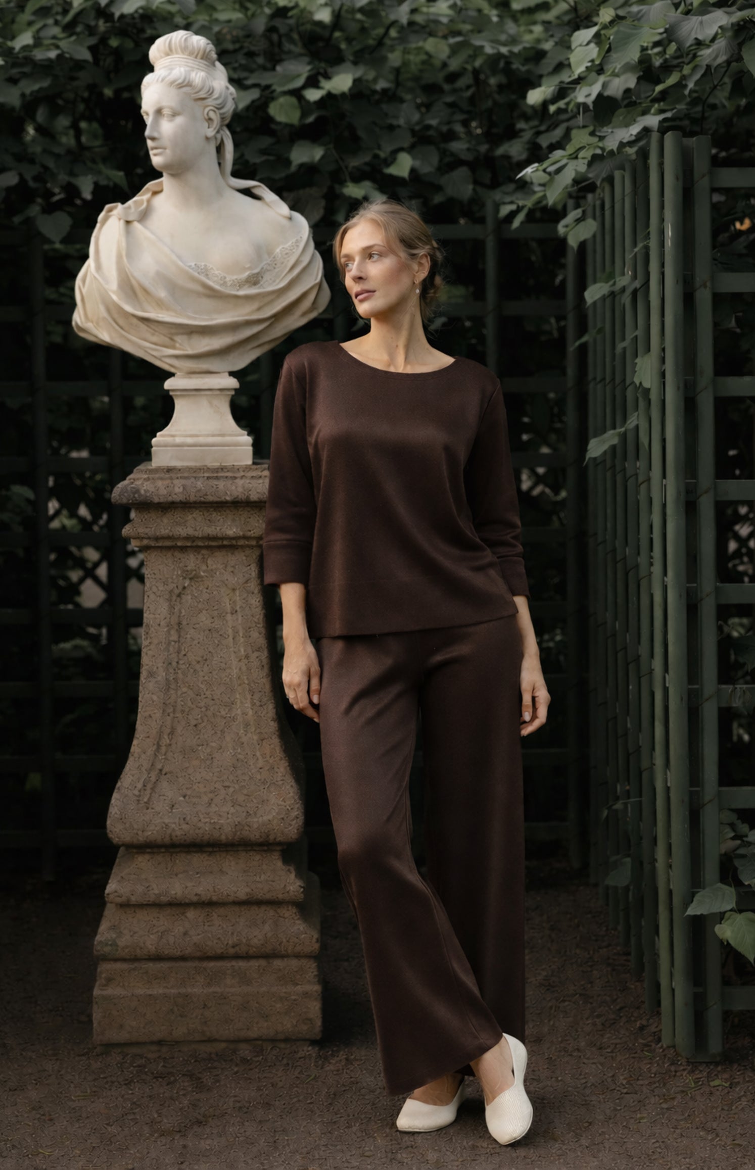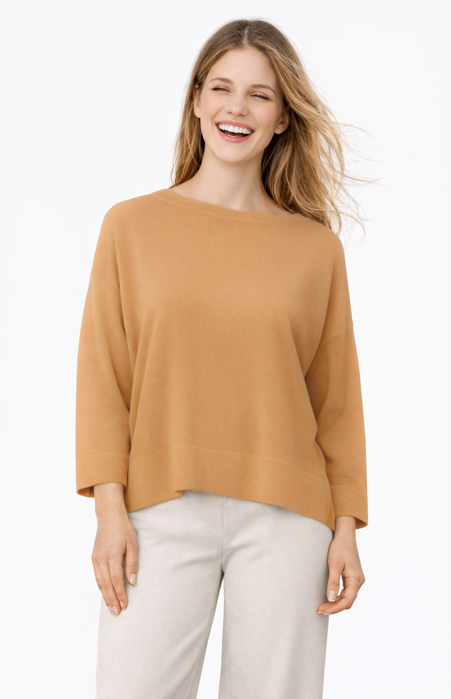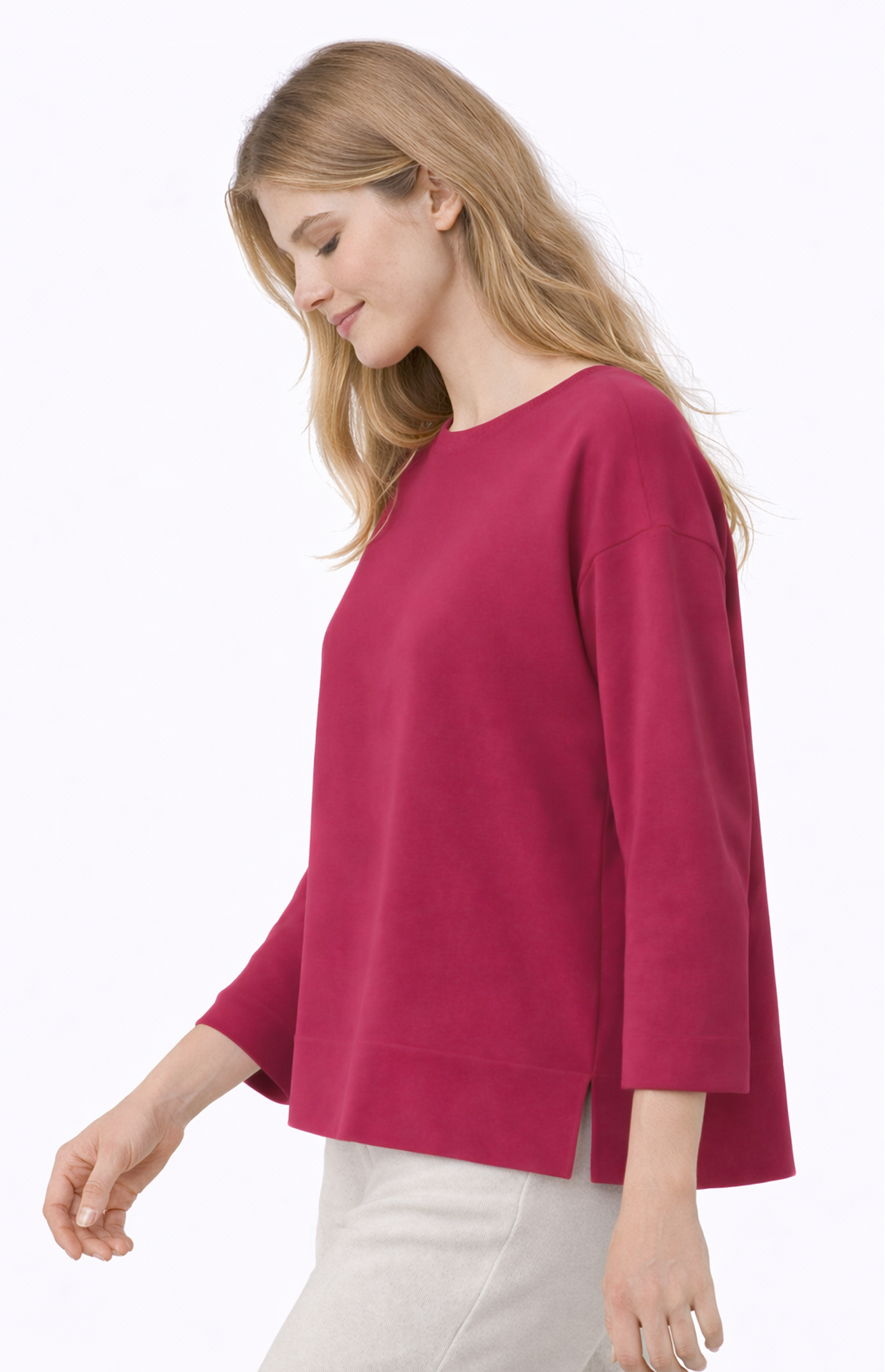 Beautiful sweater with three quarter sleeves made in Silk and Cashmere. Side slit for fluid movements. More chic and elegant blusa. Wide round neckline with tubular finish also on the bottom of the sleeves and shirt. Shoulders low and broad, not constricting on the arms.
