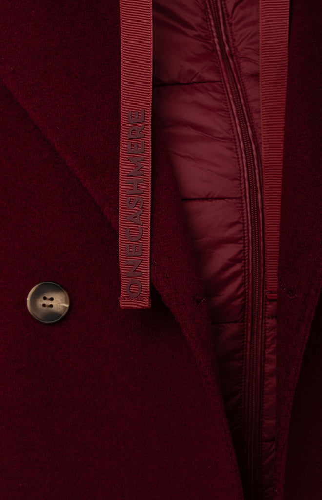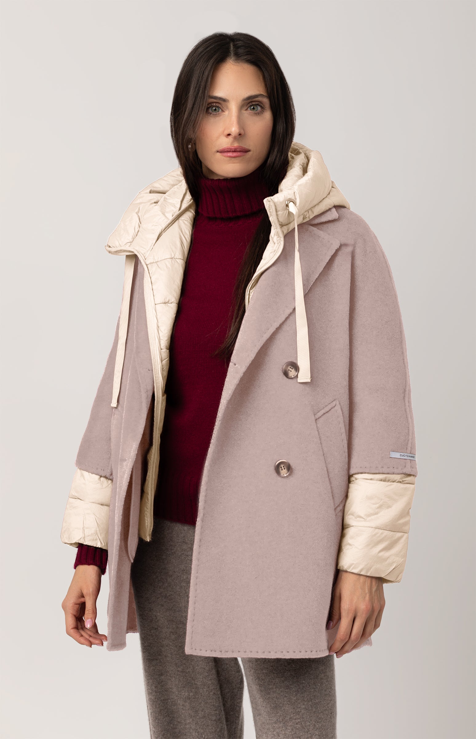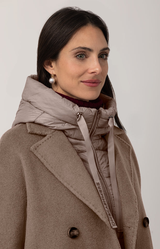 Beautiful double-breasted coat in Merino wool and cashmere, hand-stitched and featuring a removable inner down jacket — a refined and functional piece, perfect for facing different temperatures of the season with effortless style.