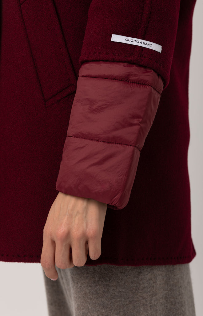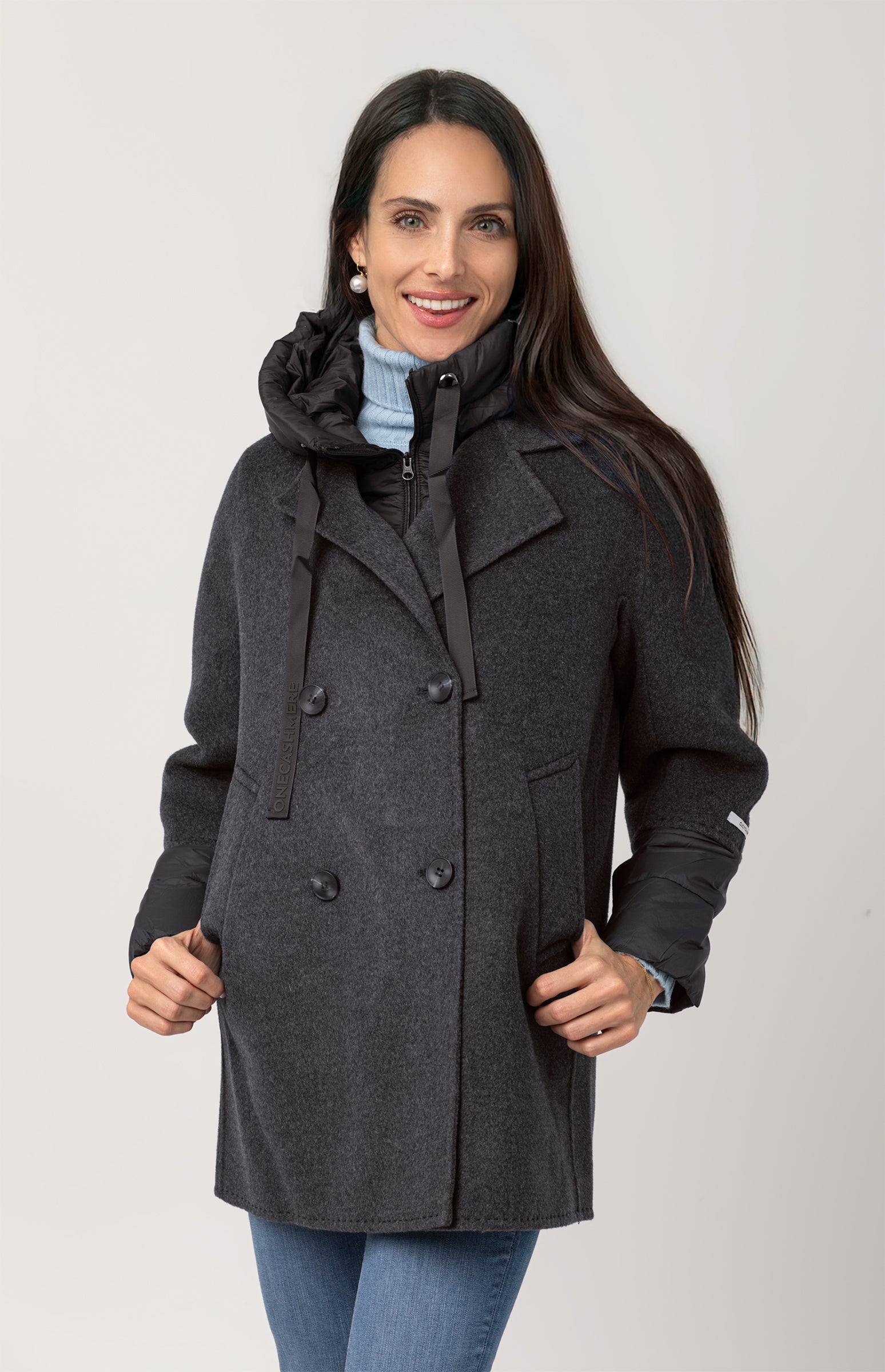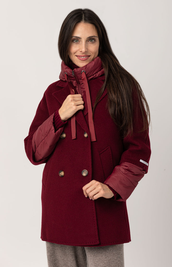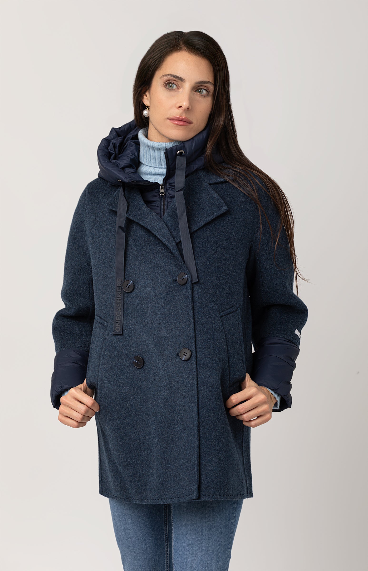 Beautiful double-breasted coat in Merino wool and cashmere, hand-stitched and featuring a removable inner down jacket — a refined and functional piece, perfect for facing different temperatures of the season with effortless style.