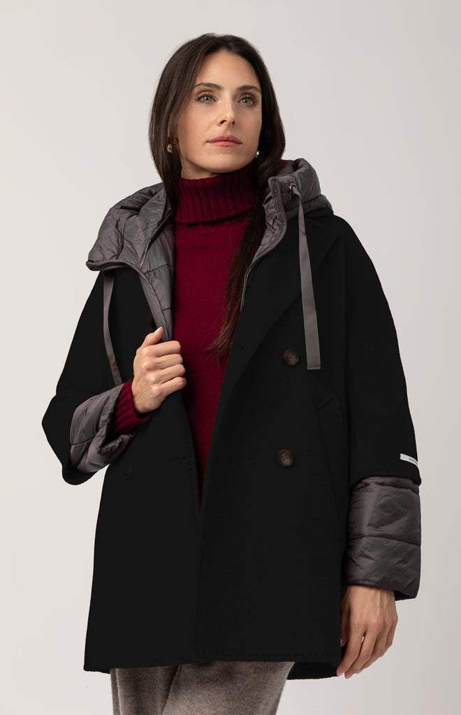 The outer coat is designed with a four-button horn-effect front, a transparent inner button for a more fitted closure, and welt pockets to be opened. The slightly shorter sleeves subtly reveal the down jacket beneath, creating a refined interplay of textures.