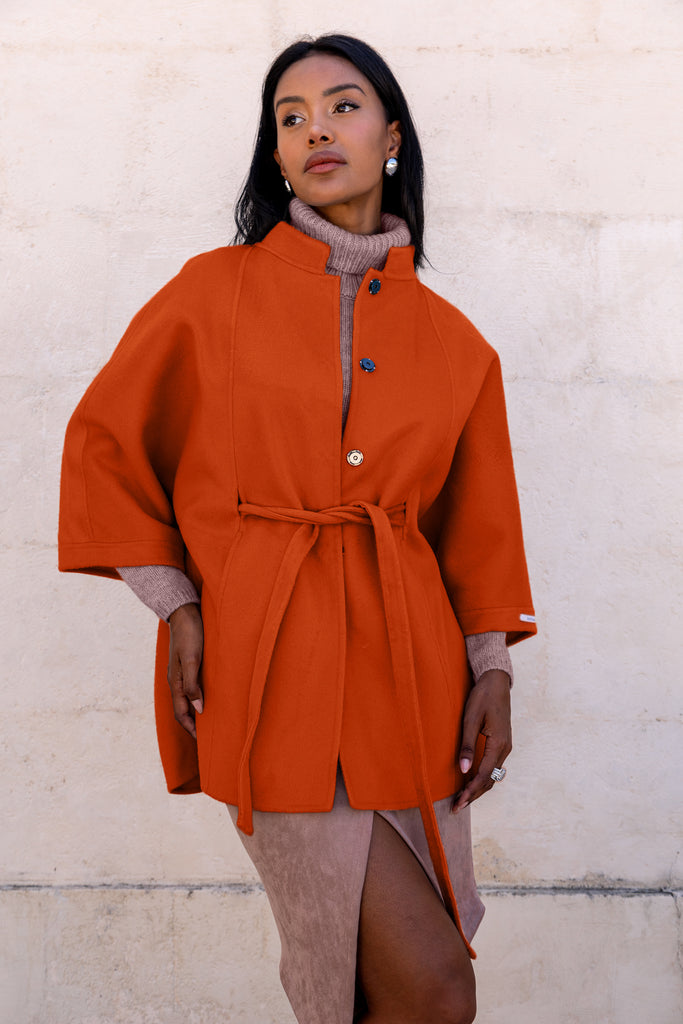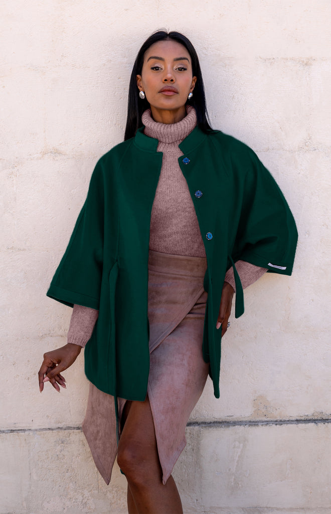 Sophisticated duster coat in Merino Wool and Cashmere. An unlined cape with refined and elegant lines, embellished with wide 3/4 sleeves and a structured funnel neckline that gives volume and character to the silhouette.