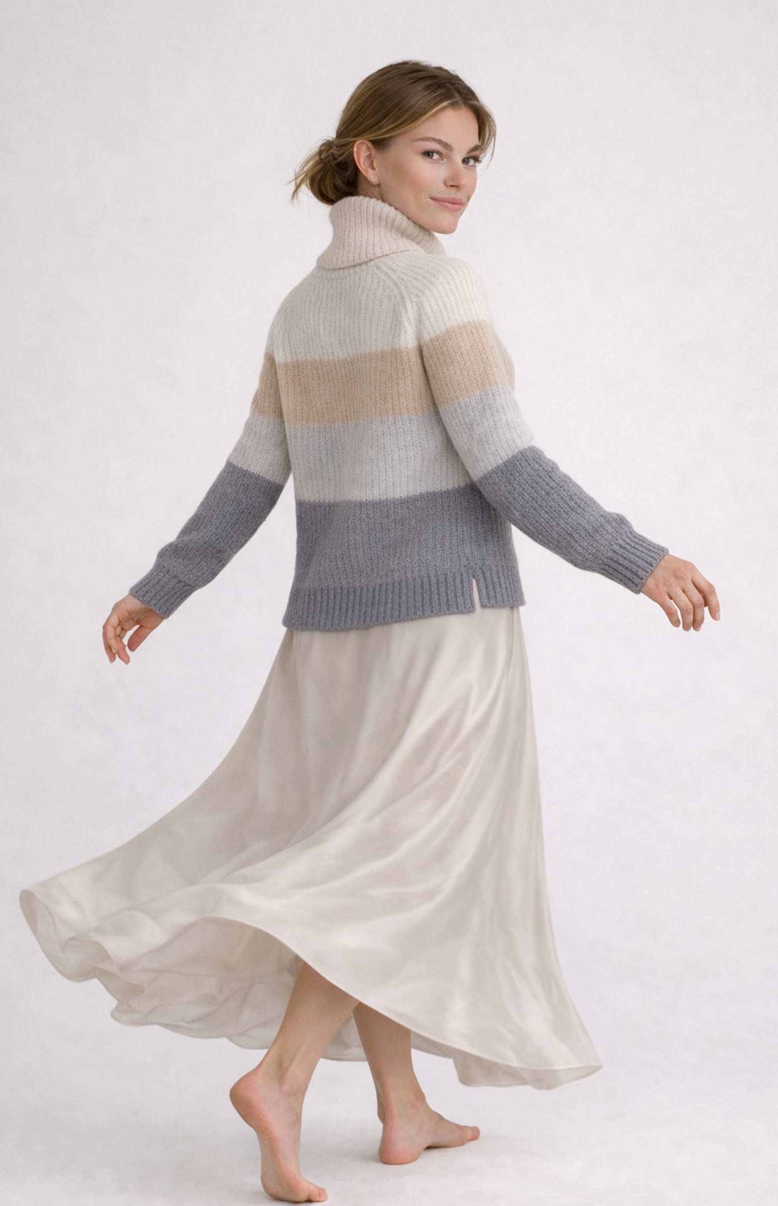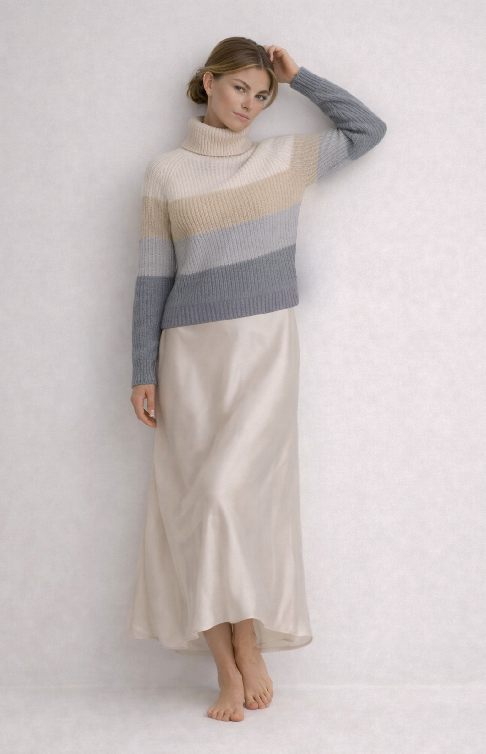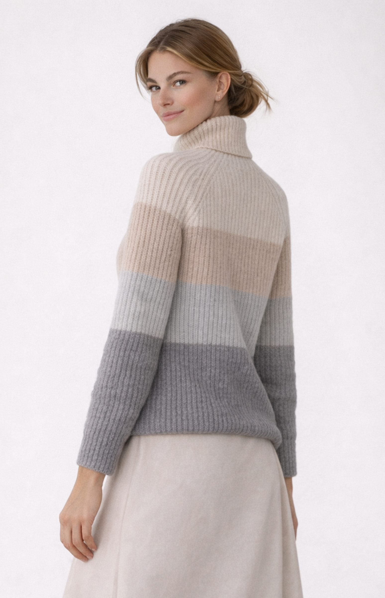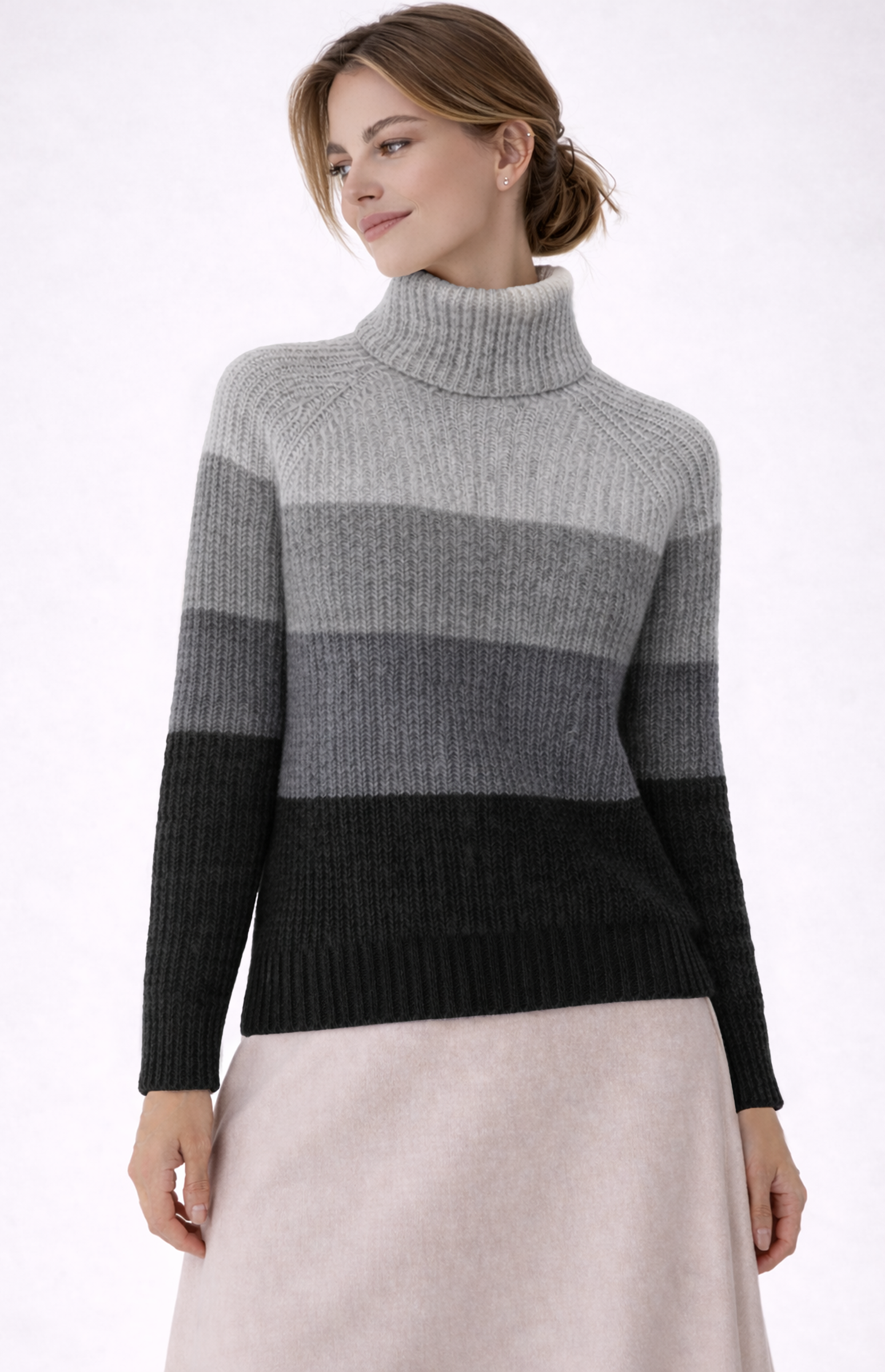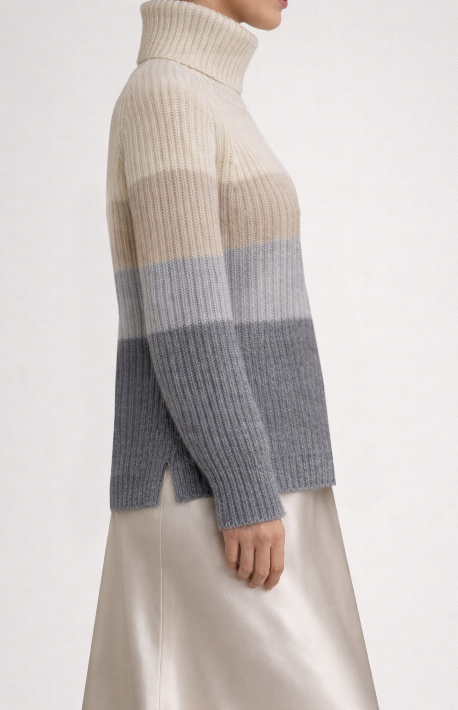 La lavorazione a punto costa inglese esalta la texture e valorizza le sfumature di colore in bande di colore in gradazione.