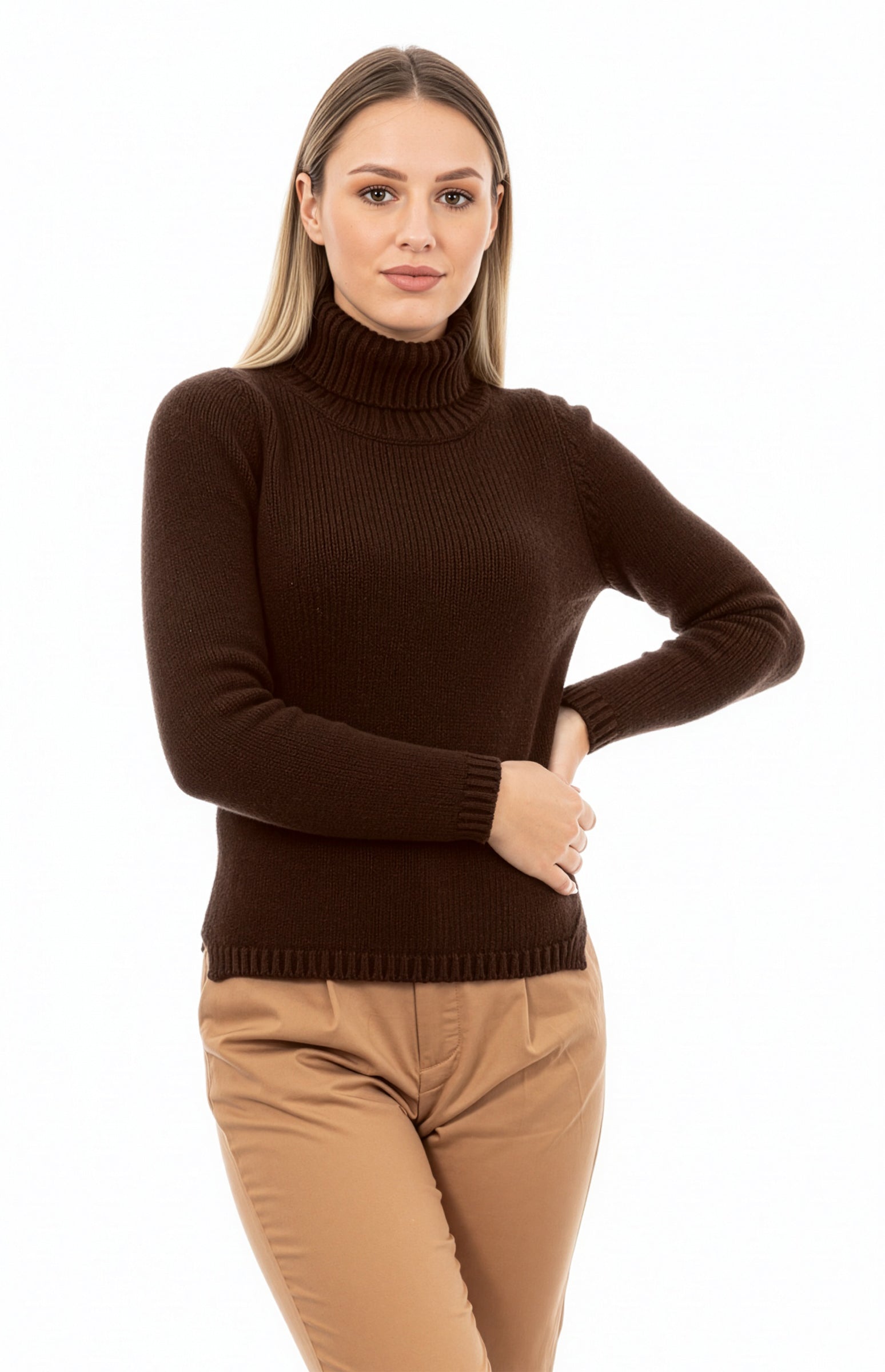 High neck stockinette sweater in rib-knit with side slits, with ribbed trim on collar, cuffs and bottom. The model on the picture wears a size S.