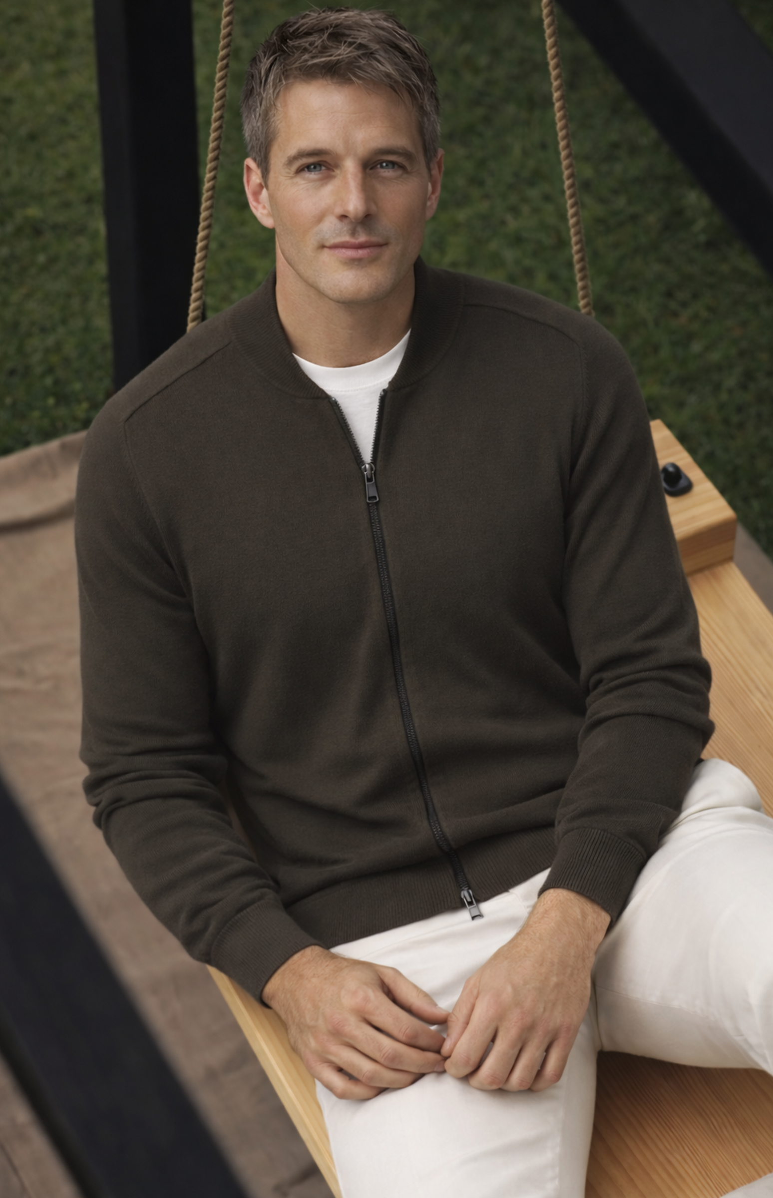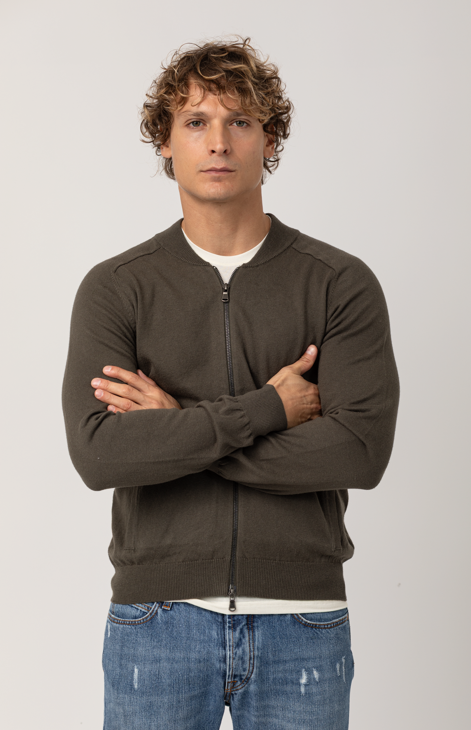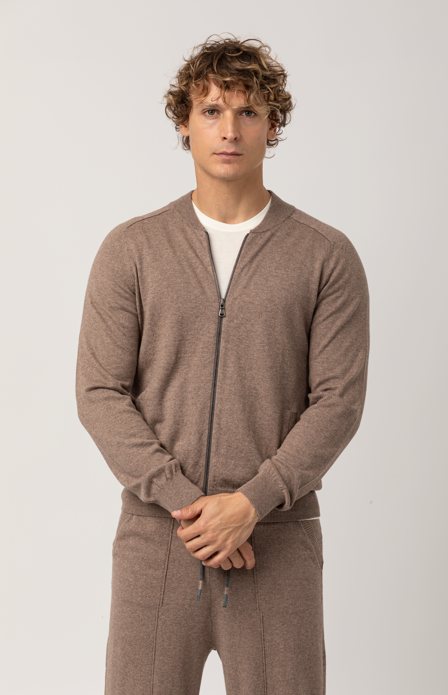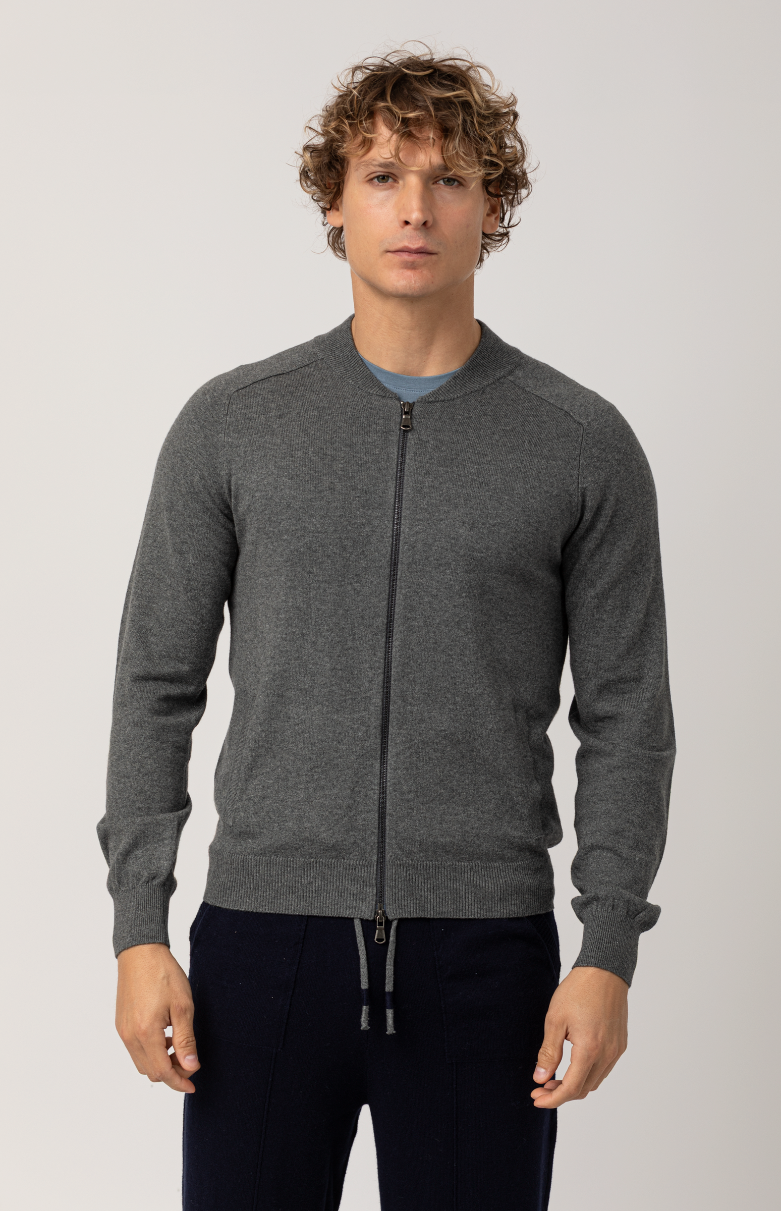 Realizzata in pregiato filato cotone-cashmere, questa felpa uomo con zip unisce la leggerezza sportiva alla morbidezza naturale delle fibre nobili. Il colletto a bombers e la zip intera definiscono un capo versatile, pensato per accompagnare i look quotidiani con discreta eleganza.