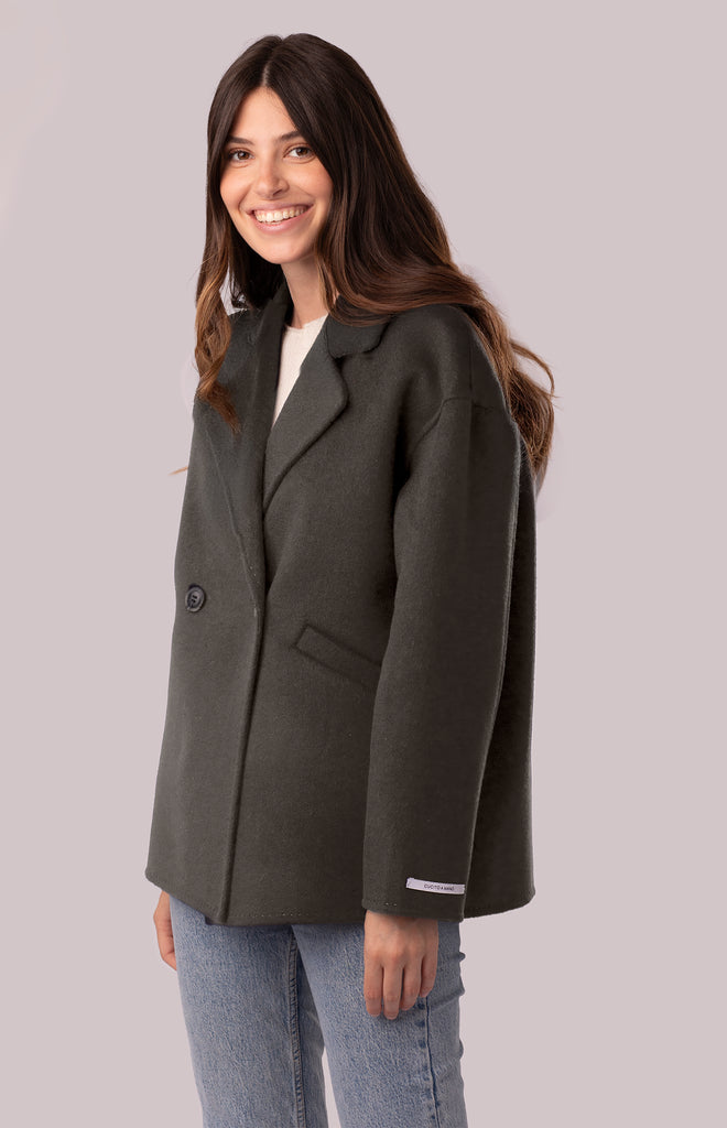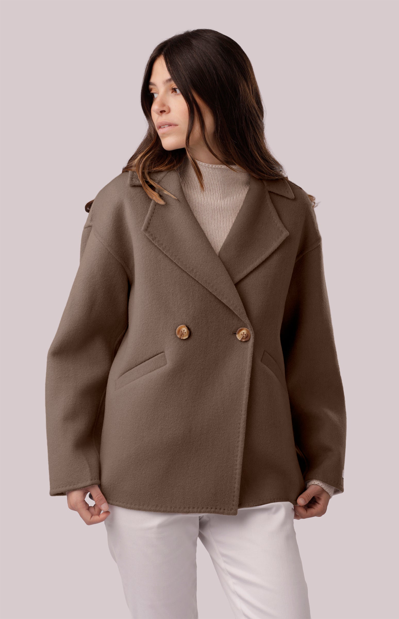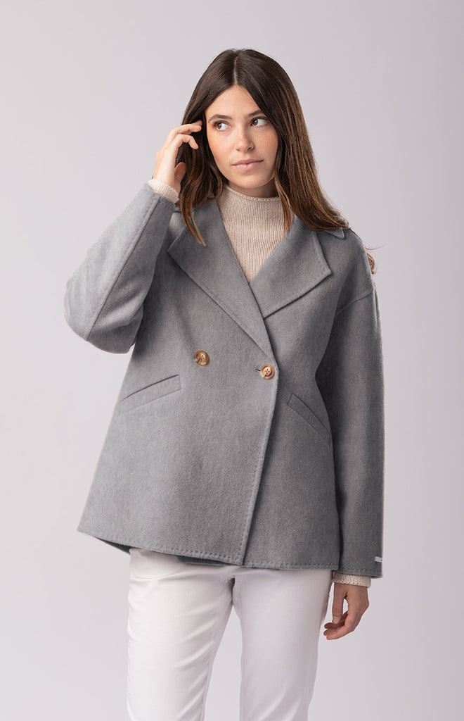 Cappotto doppiopetto da donna in morbida lana merinos e cashmere tessuti a panno. Modello a caban sfoderato corto dalla linea leggermente svasata, due bottoni in madreperla per la chiusura frontale, spalle ribassate e maniche svasate. Reverse classico, finiture cucite a mano con bordi in rilievo, cuciture a vista per dare un tocco di stile. Tasche a filetto laterali e spacchetto sul retro fondo del cappotto rendono unico questo capospalla.