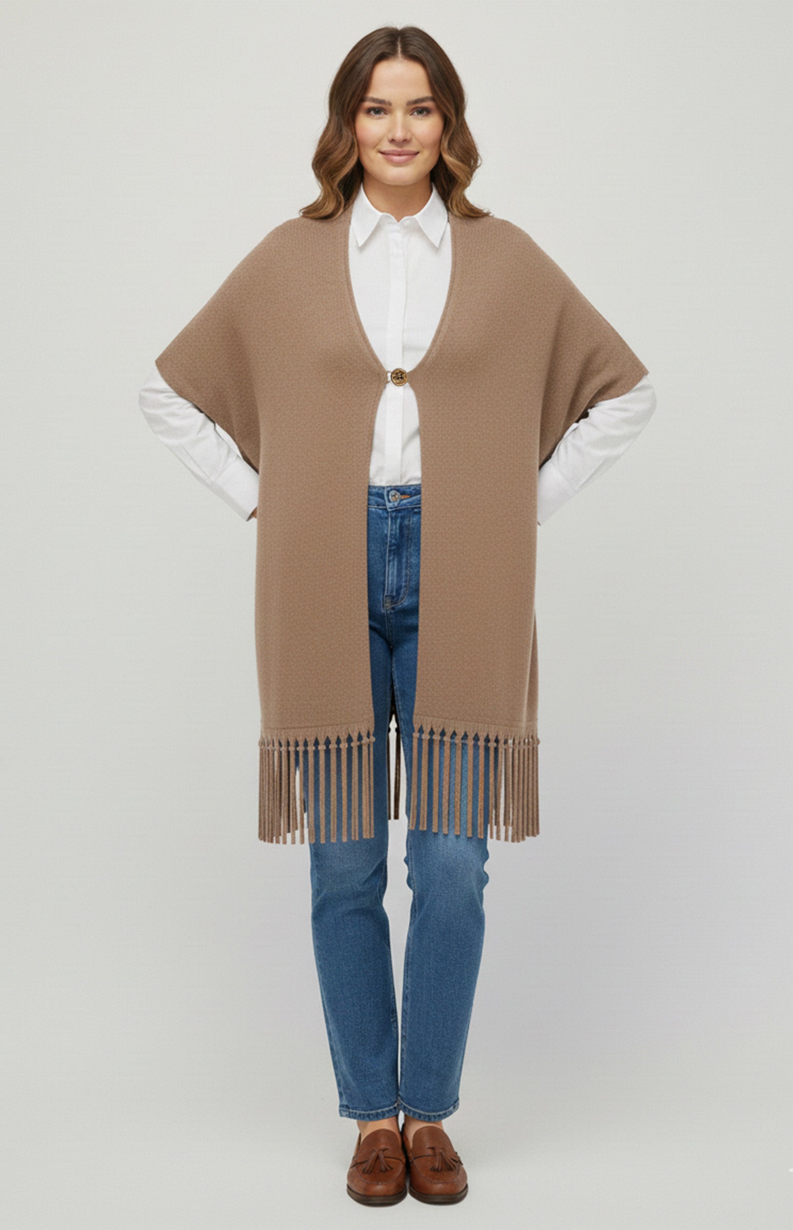Il modello presenta una linea aperta con chiusura a un solo bottone, pensata per valorizzare la silhouette con una vestibilità morbida e avvolgente. La spalla scesa conferisce al capo un’estetica contemporanea e rilassata, garantendo libertà di movimento e una naturale vestibilità.