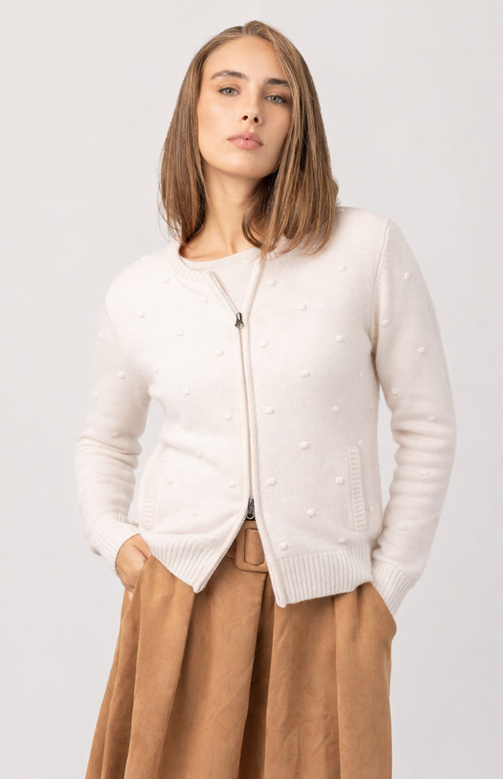 Scopri l'eleganza casual del nostro bomber giacca da donna in cashmere, pensata per offrire comfort e stile in ogni momento della giornata. Le piccole tasche a filetto frontali aggiungono praticità e un tocco di design, mentre i dettagli in 3D, con delicati pois tridimensionali, creano una texture unica che arricchisce il capo senza comprometterne la sobrietà. Le rifiniture a coste, la zip intera e la qualità del cashmere ti garantiranno un look sofisticato ma mai eccessivo, perfetto per le occasioni quotidiane o per un'uscita informale con un tocco di classe.