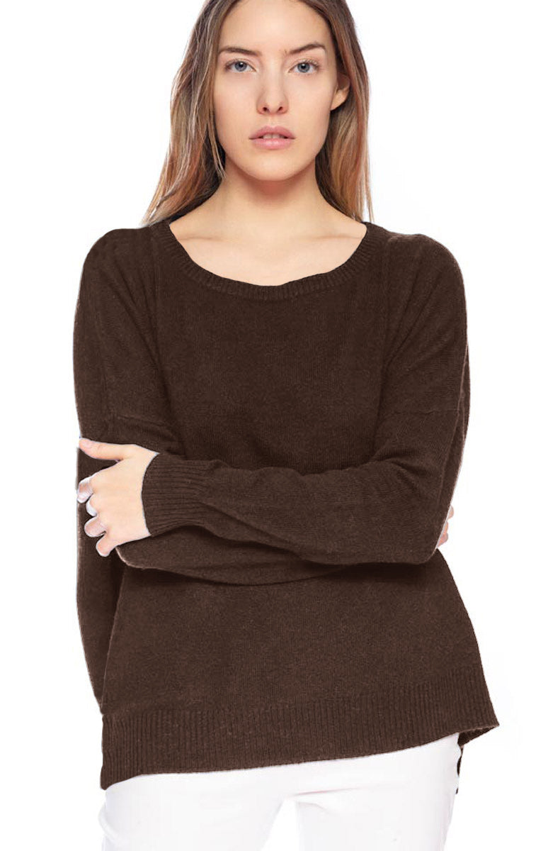Maglia morbida in cachemire over con scollo a barca a maniche lunghe; maglioncino rifinito a coste su polsi, collo e fondo.